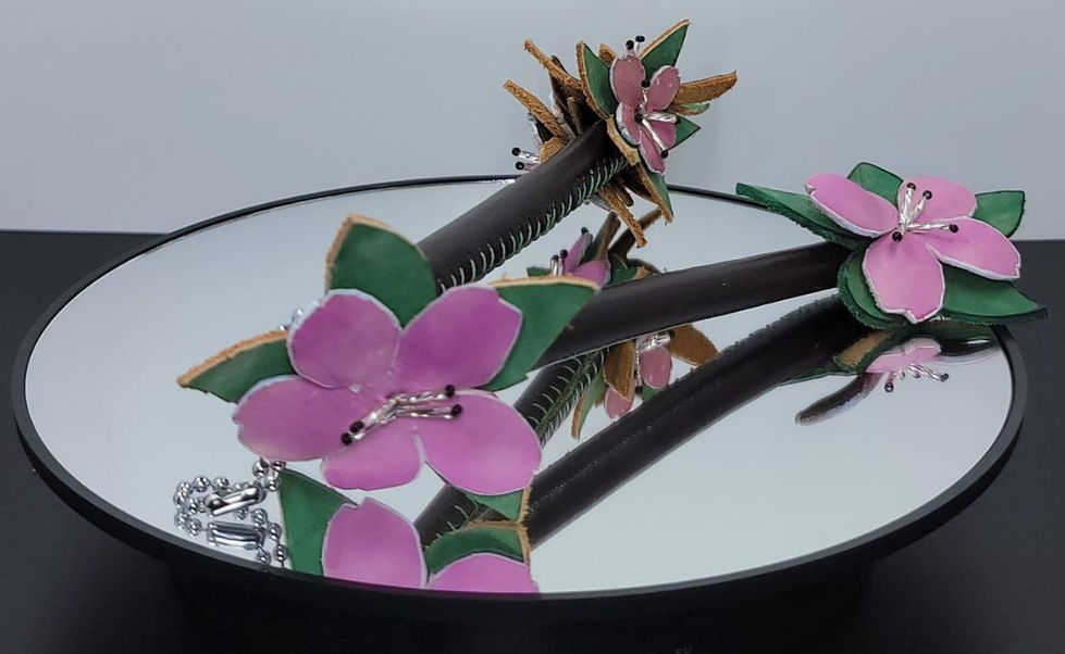 Big Blue began its journey with a special order for a bag for my client’s mother. When I received pictures of her current purse, it sparked some wonderful ideas about what needed to be reinforced, changed, and added. We started by making the bag much bigger in every direction, resulting in this vibrant blue leather tote. We then reinforced the handles and bottom, and added a zipper that was perfect for this woman on the go. After chatting with my client, I discovered that while her mother enjoyed feeling feminine, she preferred a more subtle style. So, we chose a lovely, simple tooled flower pattern with hints of pink and green on the vertical strips, offering a touch of color and femininity without being too loud. Once the bag was complete, I decided to gently stretch the boundaries of her feminine style by adding a charming, bold detailed leather bag charm, shaped like a layered pink flower with green leaves and small black bead accents, giving her the option to remove it whenever she wants, depending on her mood.